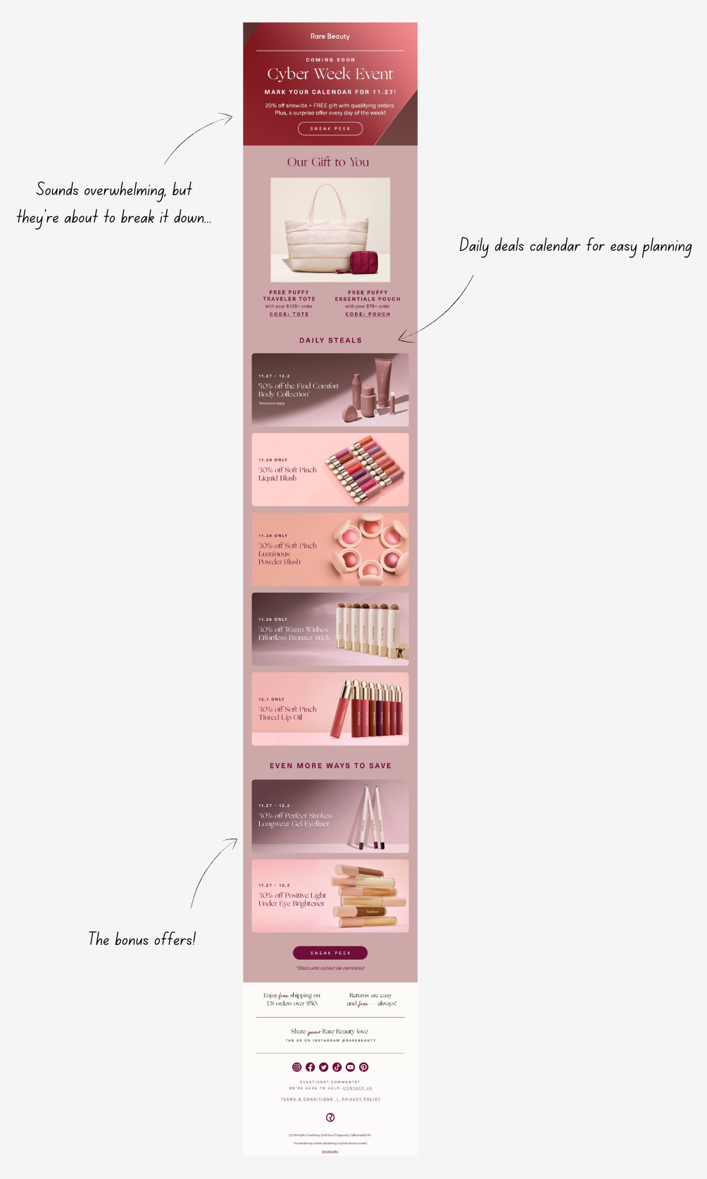 Rare Beauty were doing a LOT for BFCM, so they cleverly kicked it off with an email that perfectly set expectations for their multiple offers: 20% off sitewide, a free gift, and daily surprise deals. What really worked was how they laid out all the deals visually before the event, so if you were after a particular product, you knew exactly which day would be best for you to shop.