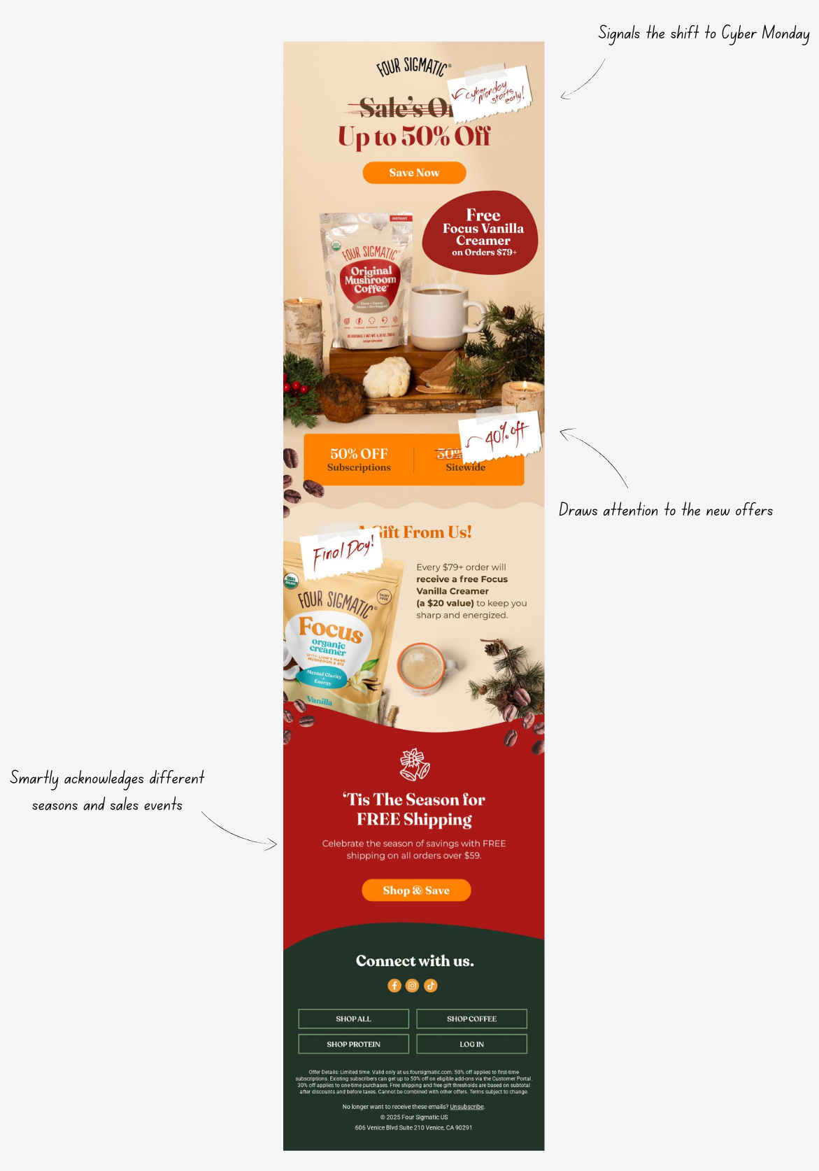 Four Sigmatic’s email landed the night before Cyber Monday and I loved it because it wasn’t just “more Black Friday!” It cleverly extended the Black Friday messaging while smoothly transitioning into Cyber Monday offers. Even better, it sprinkled in subtle Christmas hints, giving a nod to the upcoming season and bridging their campaigns perfectly.