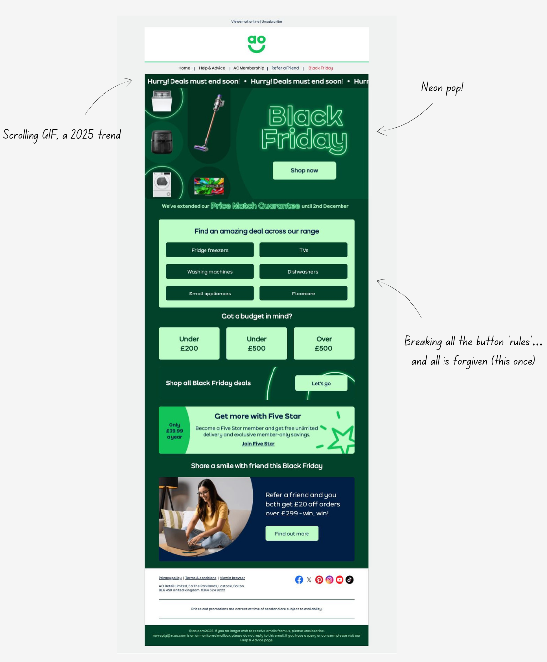 AO.com’s Cyber Week email was full-on 2025 trends: a scrolling GIF, neon banner, and plenty of big buttons. usually, I’m not a fan of multiple buttons, but in this instance, I was totally swayed. Each section was clearly split into different shopping categories, catering to all the ways people like to browse. It felt organised, easy to scan, and visually striking. Perfect for a busy inbox.