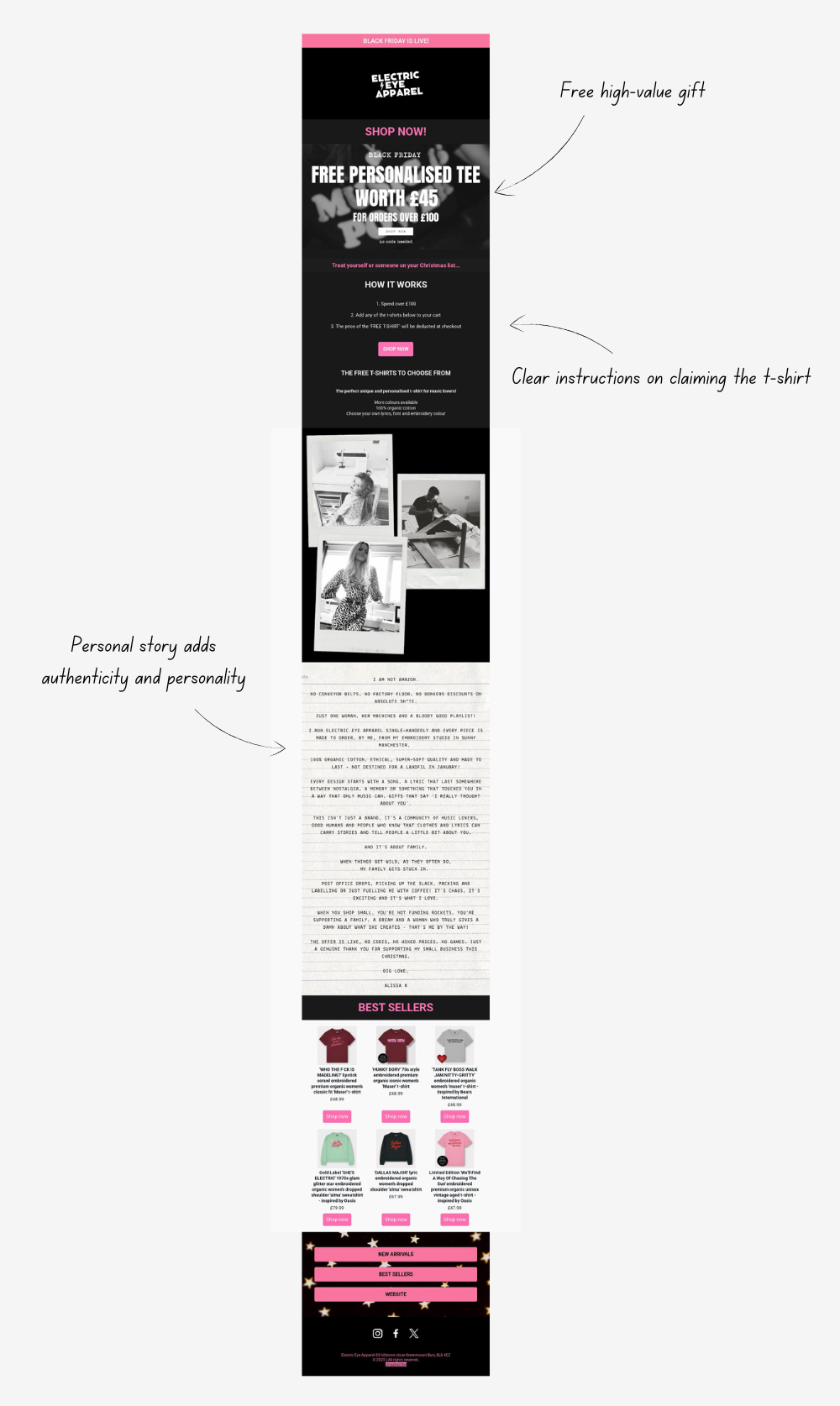 This small brand caught my eye with an email offering a free personalised t-shirt for orders over £100 instead of the usual discount. I’d had multiple conversations with people over Cyber Week, and a lot of them said free gifts were what really stood out this year because there are just so few of them in a sea of 20–40% off emails. The personal touch from the founder made the email feel authentic and memorable, and the clean, colorful layout made it a joy to scroll through.