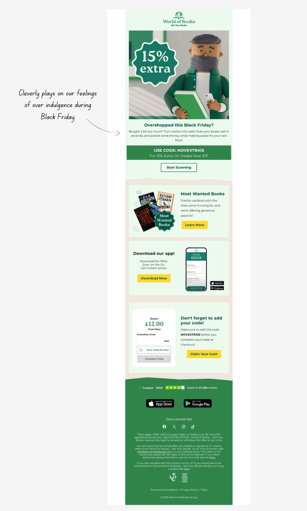 World of Books also nailed their messaging this Black Friday by tapping into post-shopping clutter. Their email encouraged shoppers to sell back books they no longer needed, offering 15% extra… perfect timing as we were all drowning in our Black Friday deliveries!