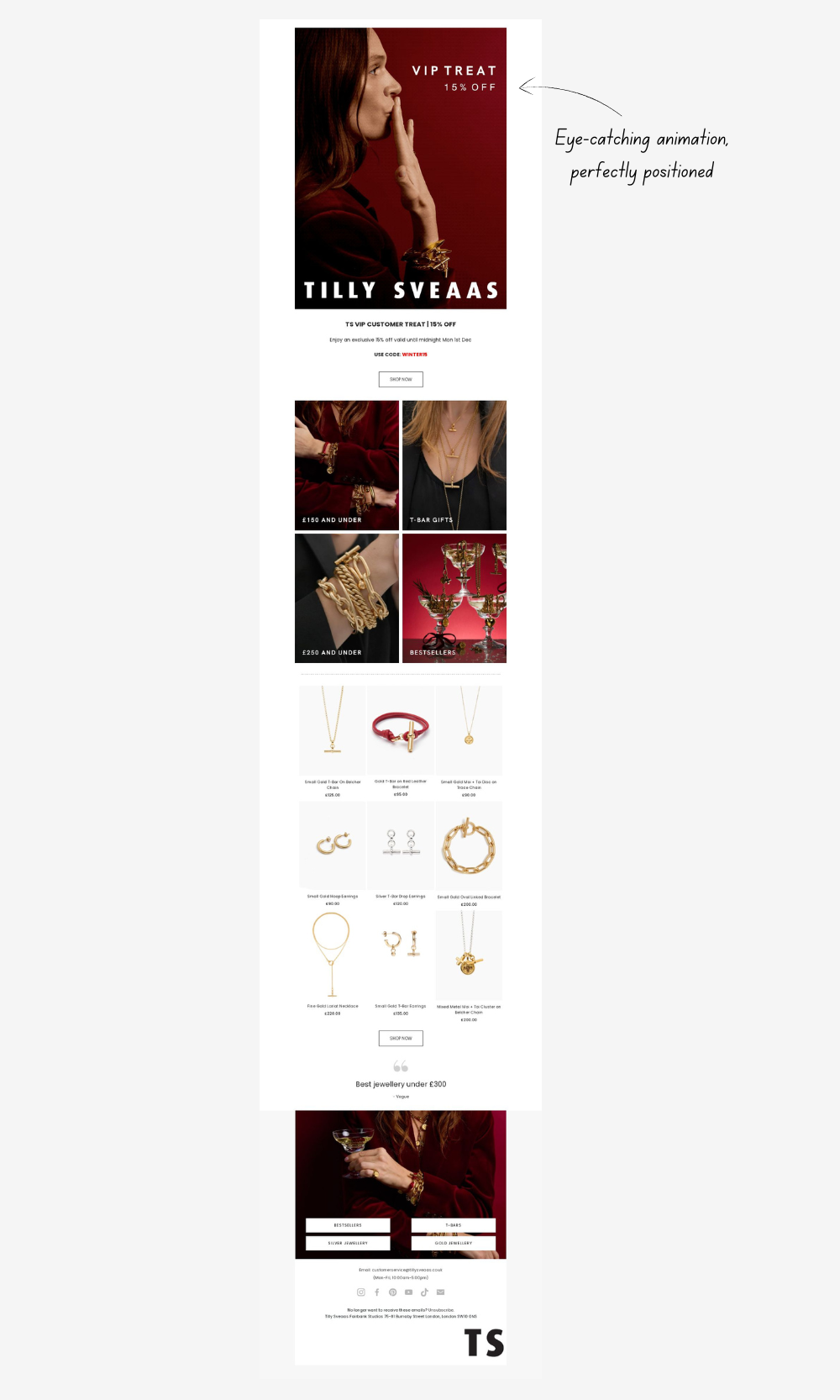 Tilly Sveeas grabbed my attention with the boldest, largest GIF of 2025. A kiss being blown toward a VIP treat headline. The rest of the email was fairly standard, but the movement and clever placement made it impossible to scroll past without noticing the main offer.